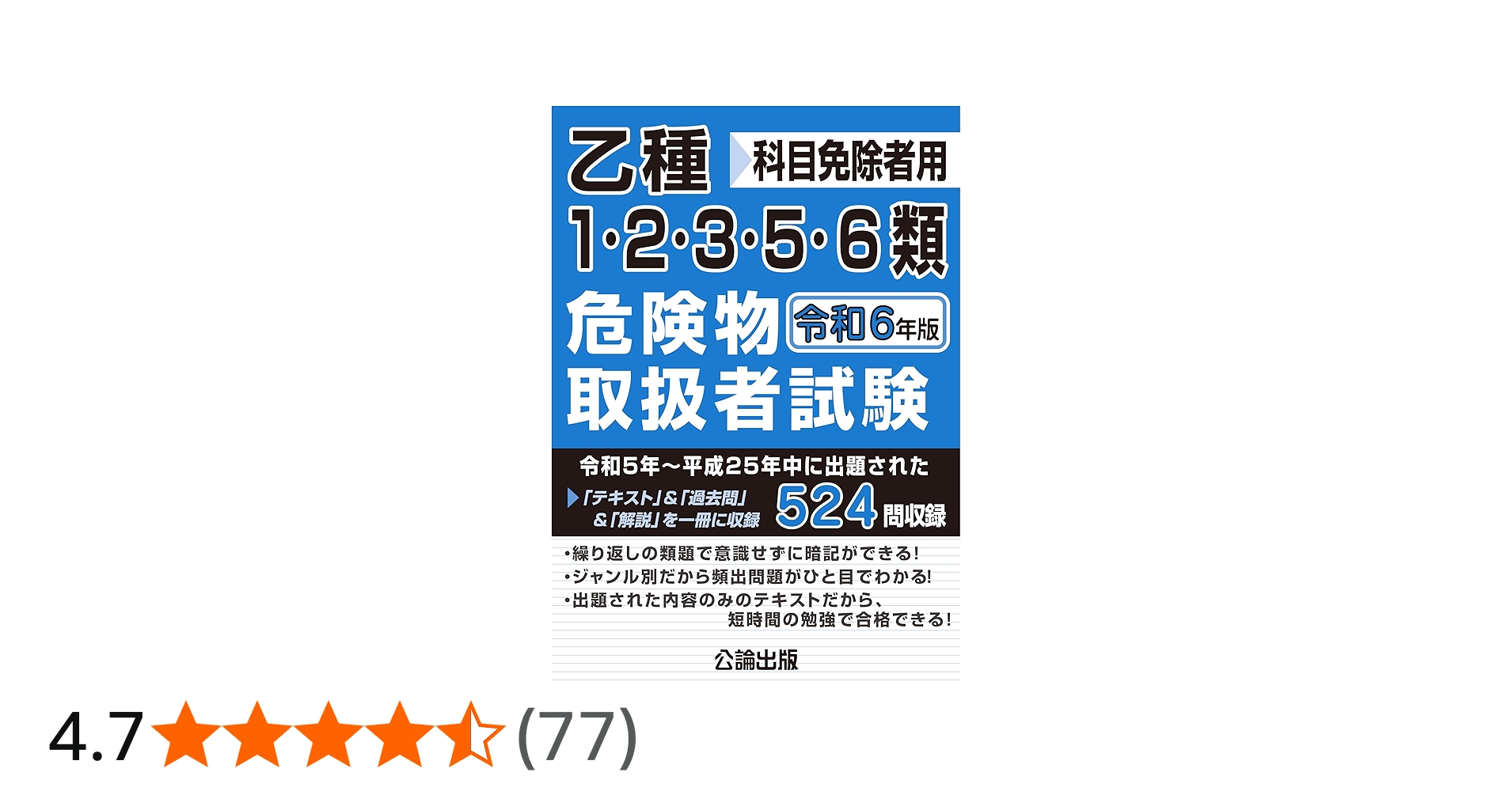 令和5年~平成25年中に出題された問題の中から、近年の傾向を踏まえた524問を収録しています。 本書は、危険物乙種の科目免除者で、乙種4類以……