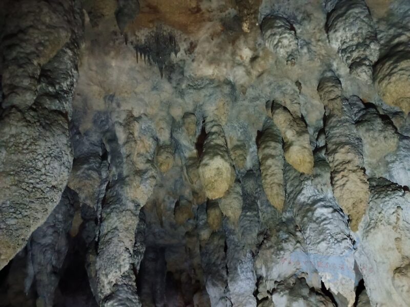 内部は照明設備も無いので真っ暗。 持参したライトで照らし進む。 そして目の前には不気味にも感じてしまう大きな鍾乳石がずらり。