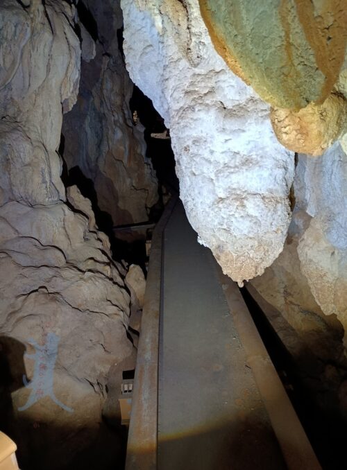 歩道を塞ぐように鍾乳石。 一般的な観光鍾乳洞ではお目にかかれなそうな光景。