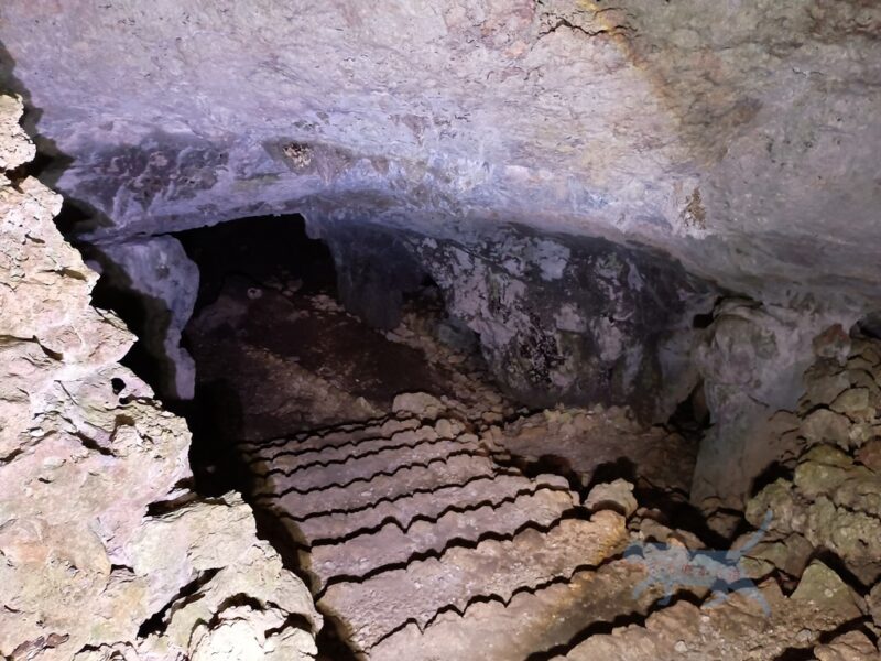 駐車場から整備された階段を下っていく。 洞窟内は「危険」と注意喚起があり見学は自己責任
