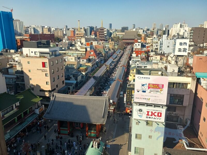 そんな雷門を上から見ることが出来るスポットが「浅草文化観光センター」 ここの展望台は無料だからか、外国人を含め訪問者が多い多い。 でも、そんな展望台より外階段が個人的にはおすすめ。 展望台は場所取りも大変な混雑だったけど、外階段は5分ぐらいいたけど、誰も来なかった。