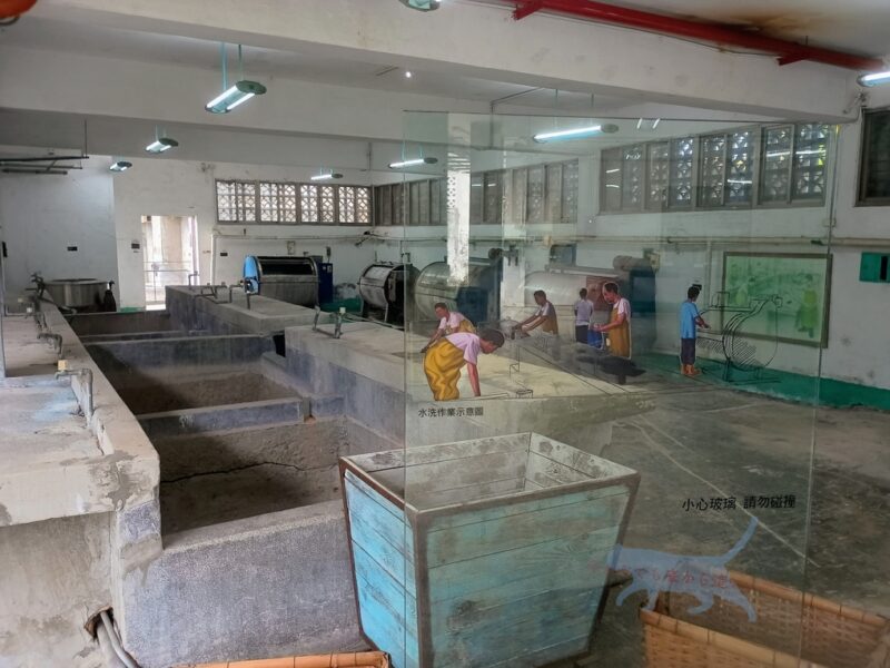 ボイラー室と壁越しに隣接する洗濯場施設。 最初理解できてなかったけど、アクリル板のイラストは当時の雰囲気を遺構と併せて見るもんらしい。