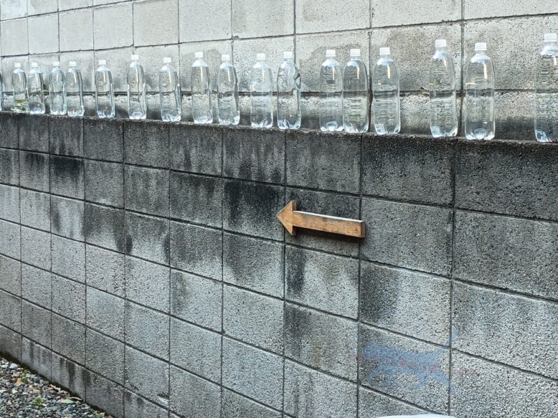 矢印表記よりも並ぶペットボトルに目が奪われる。 効果が無いといわれている野良猫よけなのだろうか… 強い意志を感じる。