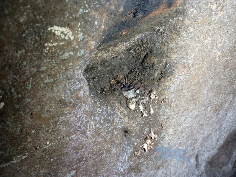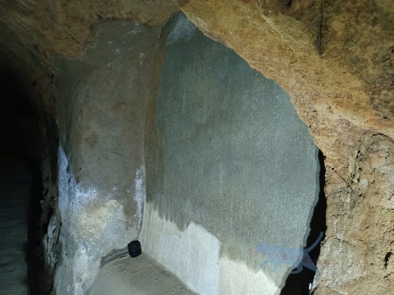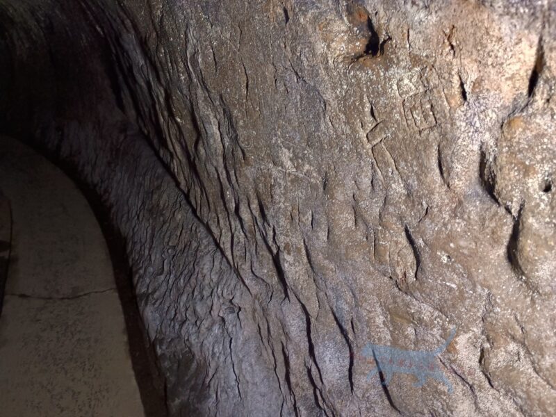 壁を見ると手掘り跡が窺える。同時に何かの記号のように見えるような箇所もありワクワクがとまらない。