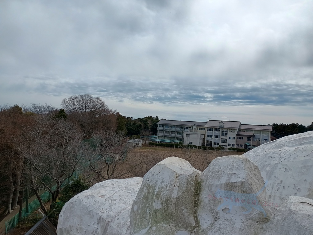 公園内に到着した時からグラウンドから生徒たちの声が聞こえていたけど、ダイダラボウの目の届く範囲にある中学校。 教室の窓からダイダラボウが見えるのが当たり前の日常