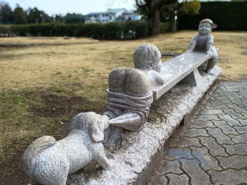 駐車場に戻るさい気づいた公園内のベンチ。これは座っても平気なタイプだろうか… 情報量が多すぎる。