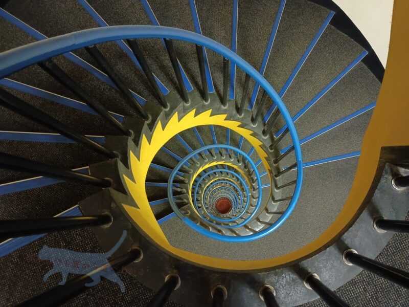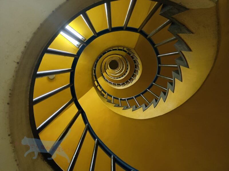 折角なので最上階の10階の階段まで来てみた。 1階から見上げた時とは違って見下ろす螺旋階段には緊張感がある。 そしてギザギザが美しい