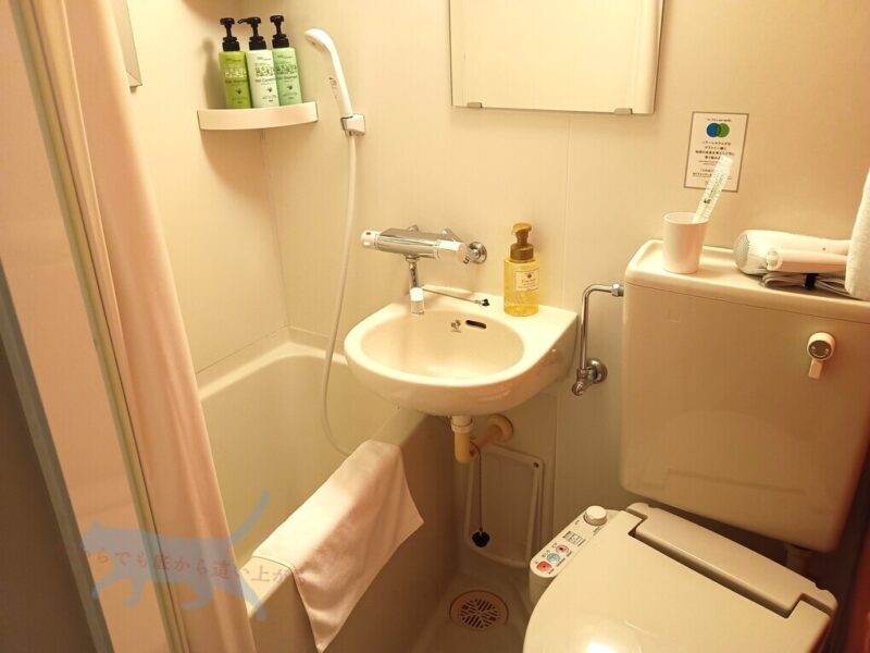 ユニットバスも実にコンパクト。 トイレのタンク上にコップやドライヤー。 湯舟が小さいからお湯が溜まるのも早い!