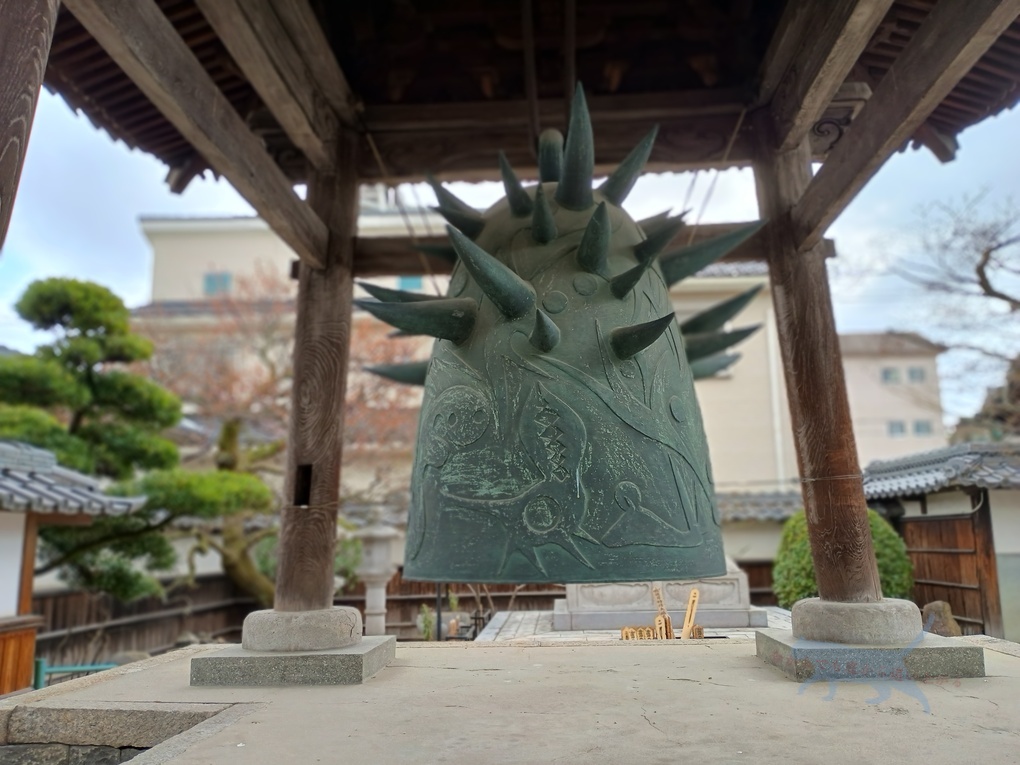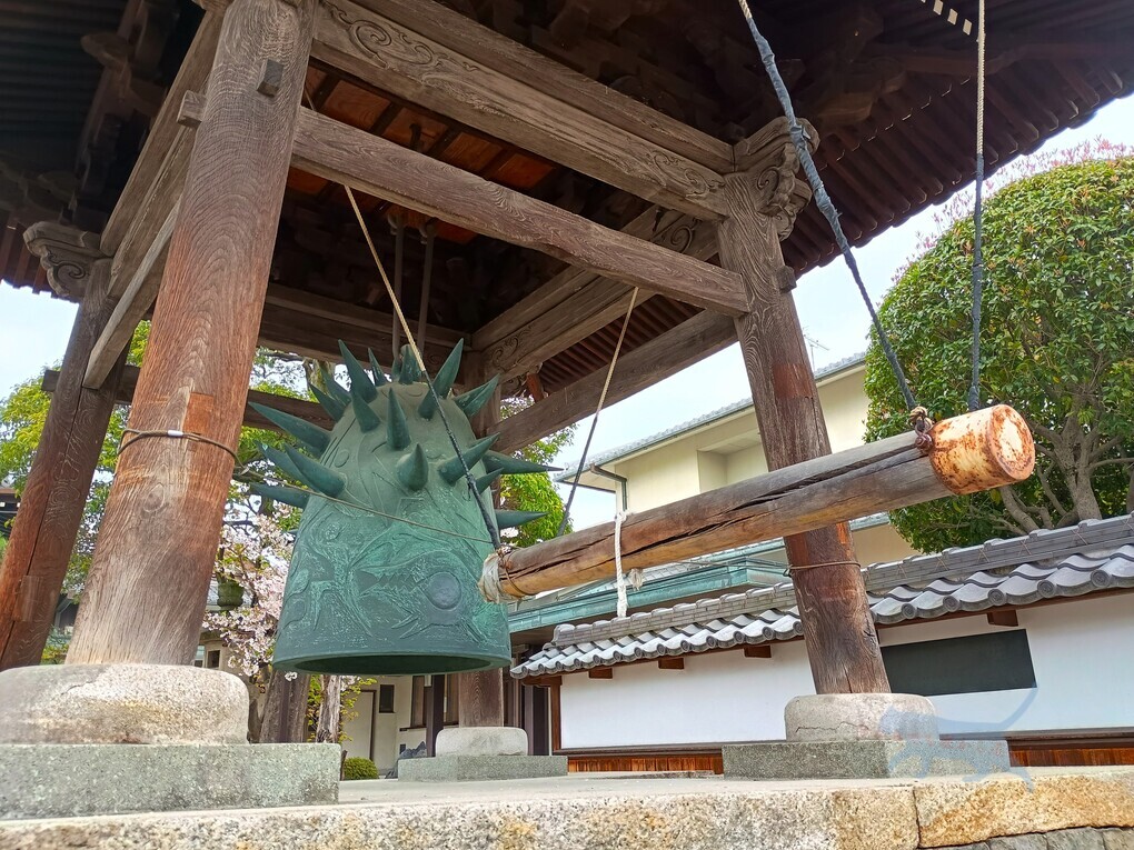 梵鐘の上半分には長さが異なるトゲトゲ。 実物をぐるりと見てイラストも堪能できて満足満足。 あとは鐘を撞ければと思うけど…