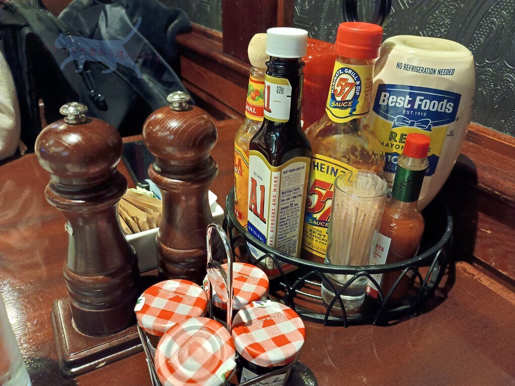 ボックス席に案内していただく。 アメリカ語なんて話せない自分たちなので、アメリカ語のみのメニューからハンバーガーという文字を見つけて注文。 ※後日知ったけど日本語のメニューもあるらしい。