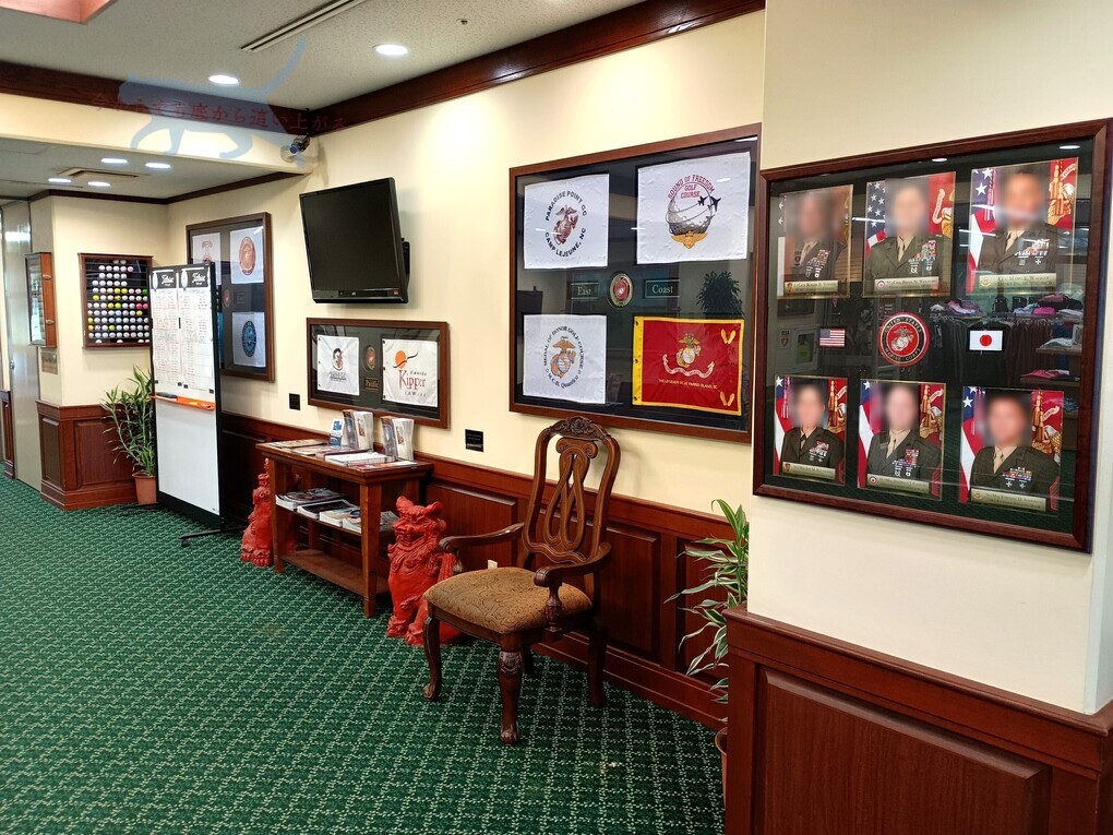 勇気を振り絞り1階のロビー。 ゴルフ関連のショップがあるけど基地らしい雰囲気。 そんな中でもシーサーがあって何かほっこり。トイレも借りたけど、まさにアメリカという雰囲気のトイレ。 行ったことないけどw