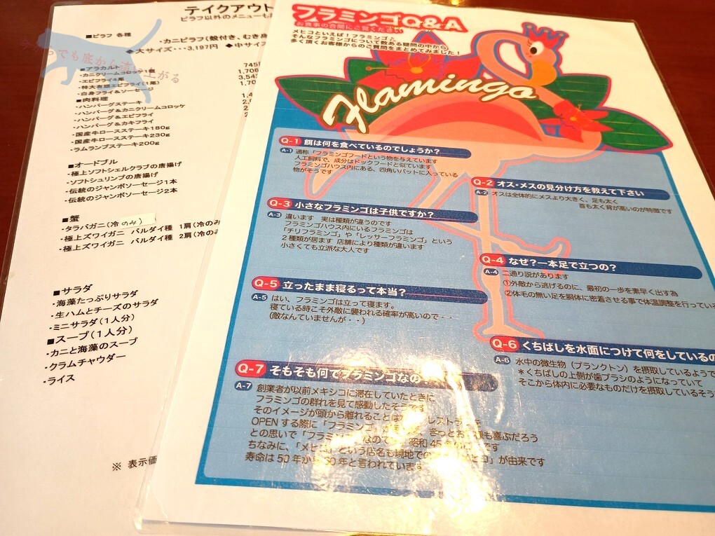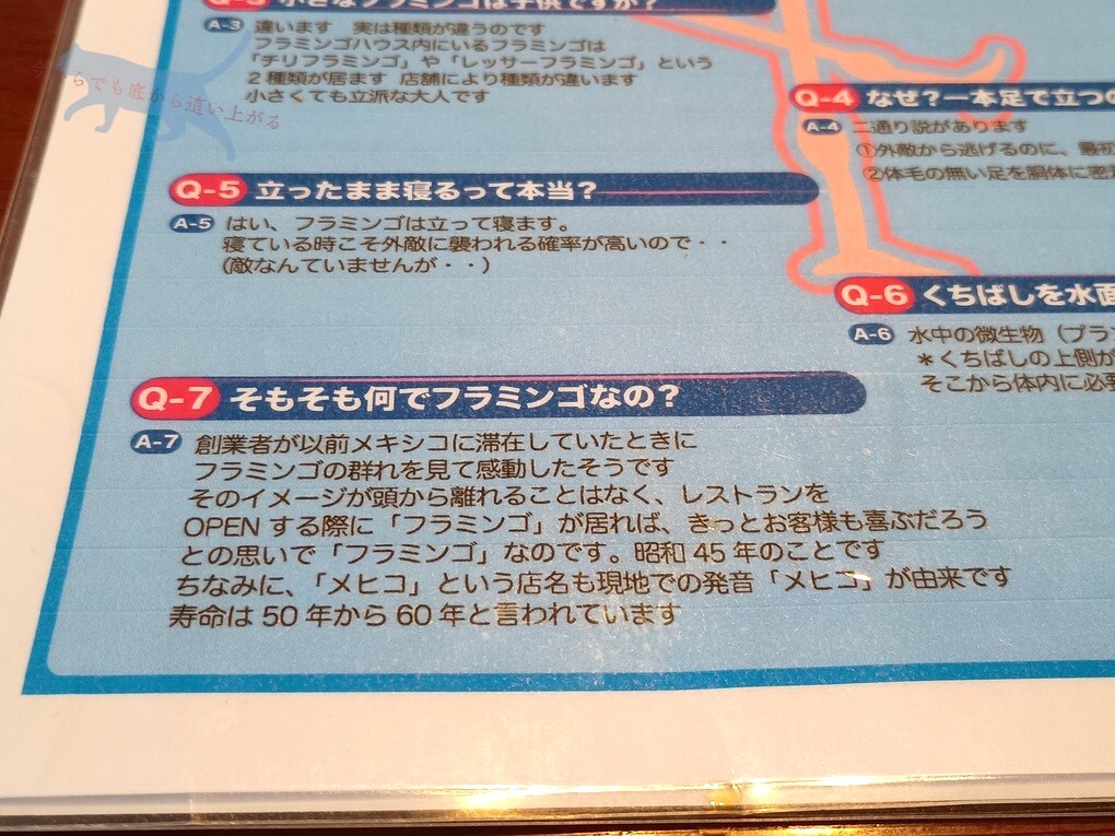 フラミンゴの群れに感動して見惚れてしまう。 メニューと一緒にあった「フラミンゴQ&A」が(・∀・)イイネ!!