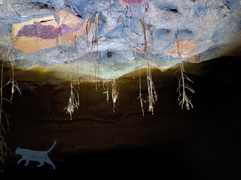 他にも壕内には他の壕と通じる十字路や女子生徒たちの休憩所なども案内していただく。 壕内の一部通路は崩落してしまっていた。 中でも印象に残っているのは朝鮮人兵士が天井に書いた文字。 ※ライトを文字に当てるのも禁止。