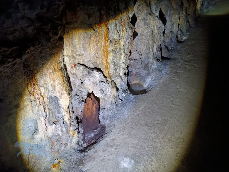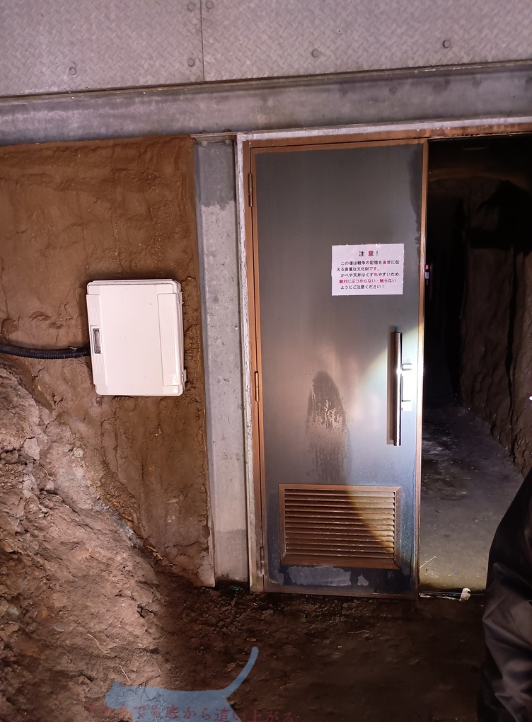 2重扉になっているのは壕内を風化させず後世に残すため。 なので壕内では残置物はもちろんのこと壁や天井などに触れることは禁止。 南風原は砂岩と泥岩が多く、掘りやすい一方で崩れやすいらしい。