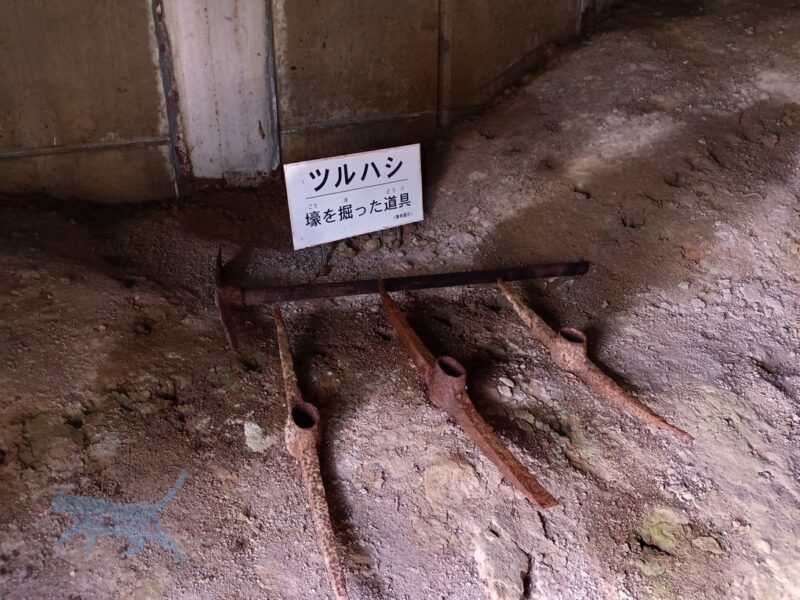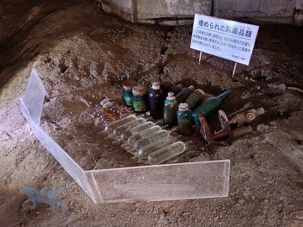 入壕すると壕を掘るさいにつかったツルハシと壕出口付近で地中に埋められていたという医薬品類も展示。アンプルなどには未だに液体が確認できる。