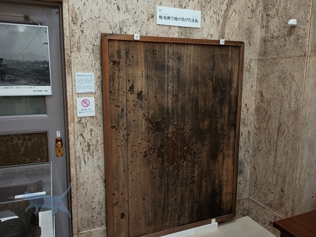 実際の焼夷弾にて焼け跡が残っている床板なども含め、展示品の中には寄贈された物も多い。