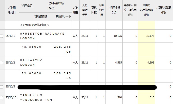 ウズベキスタンでは10回ぐらいタクシー移動をしましたが、ほとんどが現金払い。 最後の最後にせっかくだから体験してみようと1回だけカード払い。その分の運賃も11月分の請求で支払い済み。