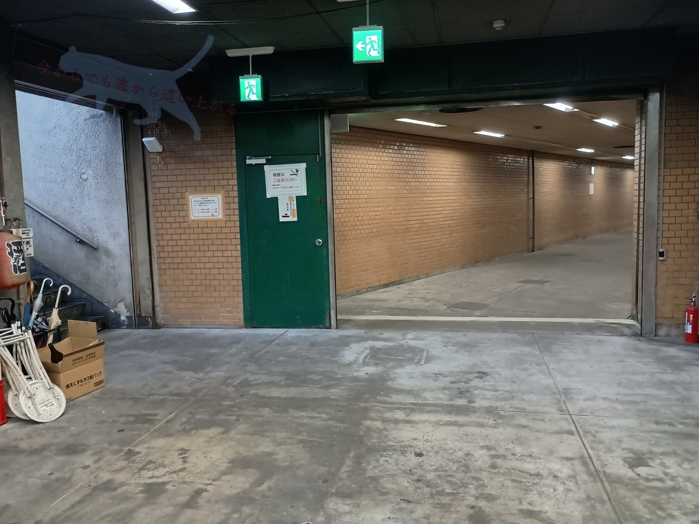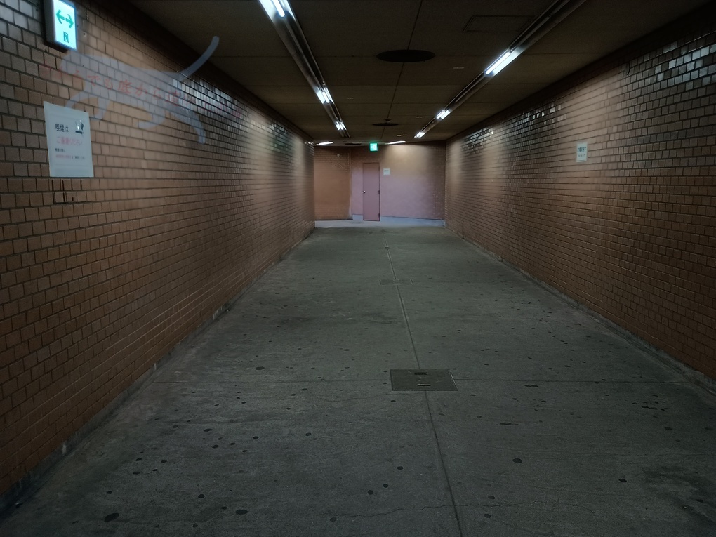 奥が入ってきた出入口。 ポスターやペイントも無いタイルが良い感じだけども、地下街というより地下通路という印象。