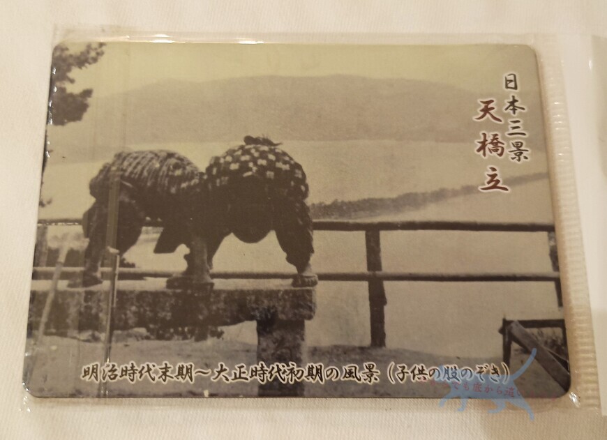 股のぞきは明治33年(1900)頃に傘松公園に展望所を設置し広まった。股のぞき写真入り絵葉書をお土産として販売し、全国に股のぞきが認知されるようになった。   ※発祥の地には諸説あるようです。