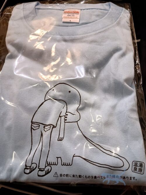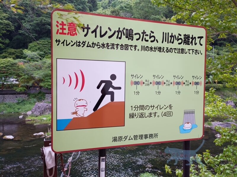 放水時の注意喚起の看板に一緒に避難しているはんざきの姿がかわいい。