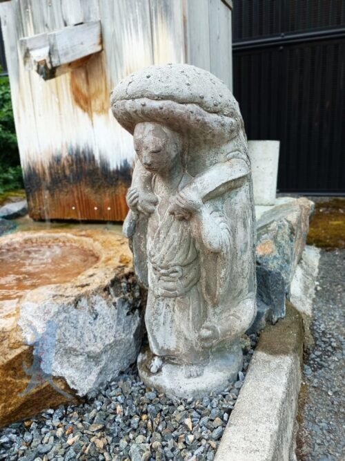 二宮金次郎像の近くにあった、はんざきを背負う像。粘膜でぬるぬるしそう