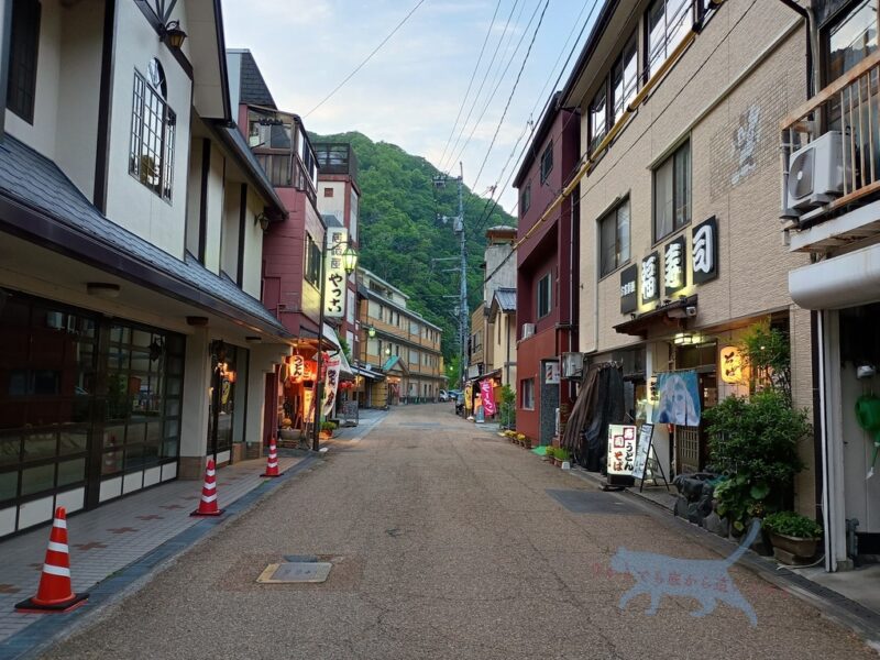 温泉地らしい雰囲気がたまらん。通りには元禄元年(1688)に開業の宿もあった。