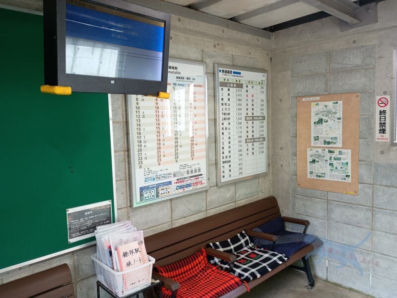 風を凌げる待合室。人気駅にはマストアイテムの駅ノートの数がすごいね。