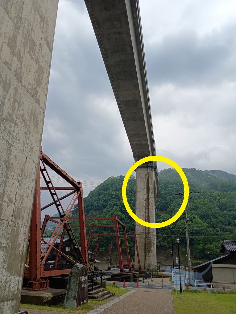 改めて下から見上げると、新旧橋梁の切り替え工事の大変さが伝わってくる跡が見られる。カーブ詳細はググって