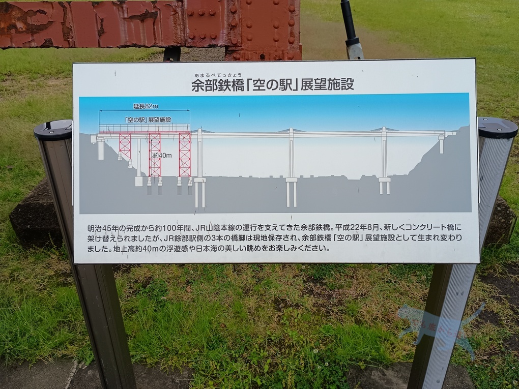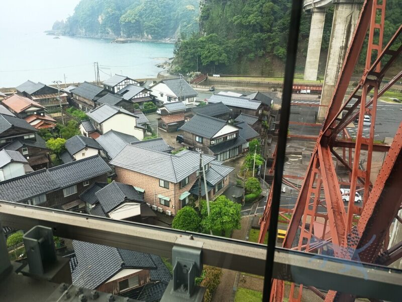 日本海や旧鉄橋もよく見える。同時にこの高さから車両が落ちたと想像するだけでも恐ろしい。