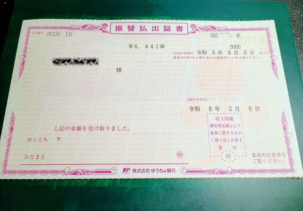 住所・名前・捺印をして郵便局窓口に身分証と共に提出。 無事に窓口にて現金¥6.441円を受け取りました。