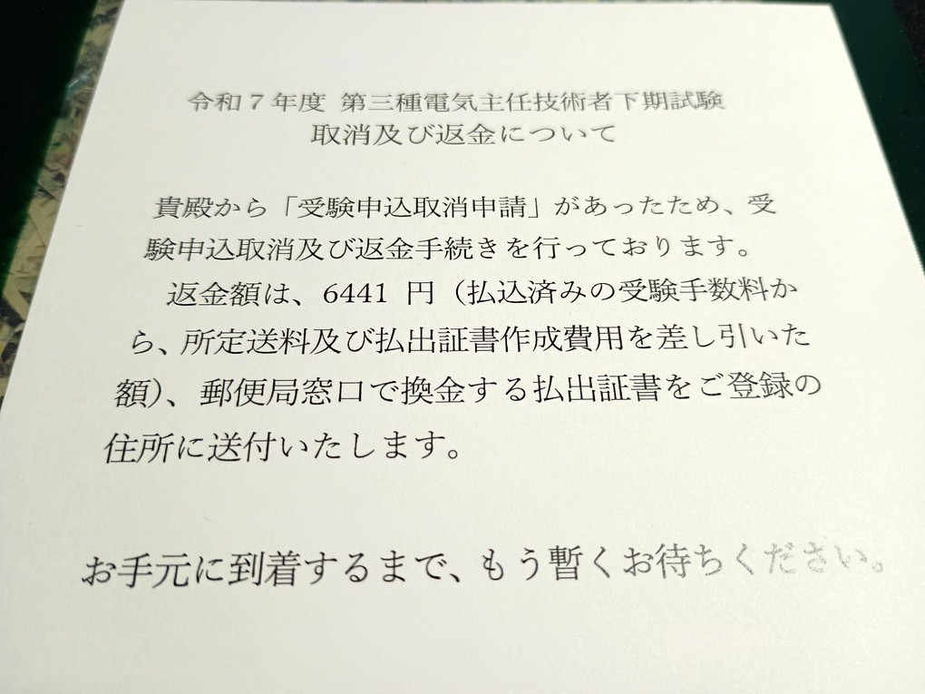 まったくわからない状態で受験しても仕方ないよなという思いが日に日に強くなっているときに、実は電験は受験申し込み後でも受験料の一部が返金されると知り、その手続きを経て一部が返金されました。