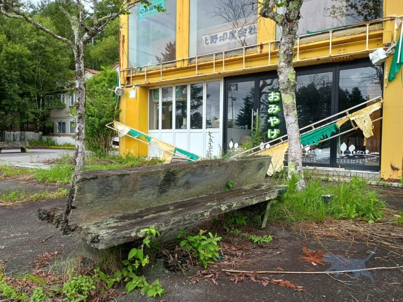 栄枯衰退を見てきただろうベンチ。 駐車場のコンクリから草木が自生してるのがエモい